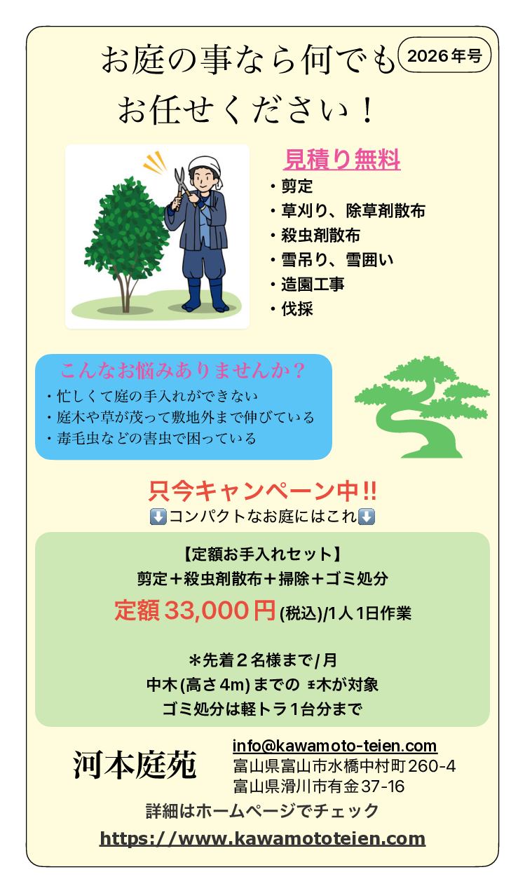 富山県で剪定/伐採/雪吊り/肥料/草刈り/除草剤/殺虫剤/造園/外構…お庭のお困りごとは【河本庭苑】に全てお任せください。お庭から大規模な緑地まで幅広く対応しております。専門家の私達に何でもご相談ください。